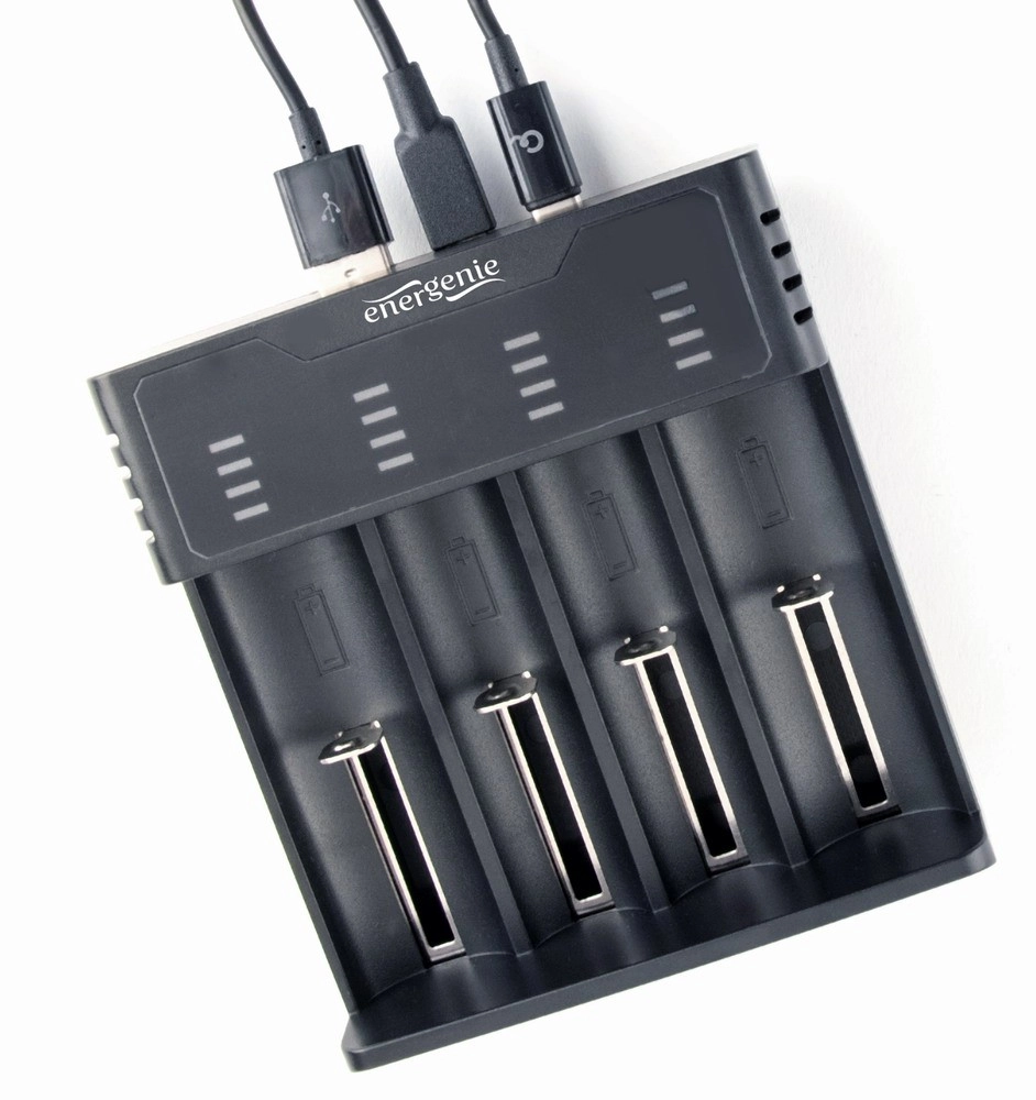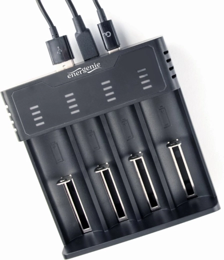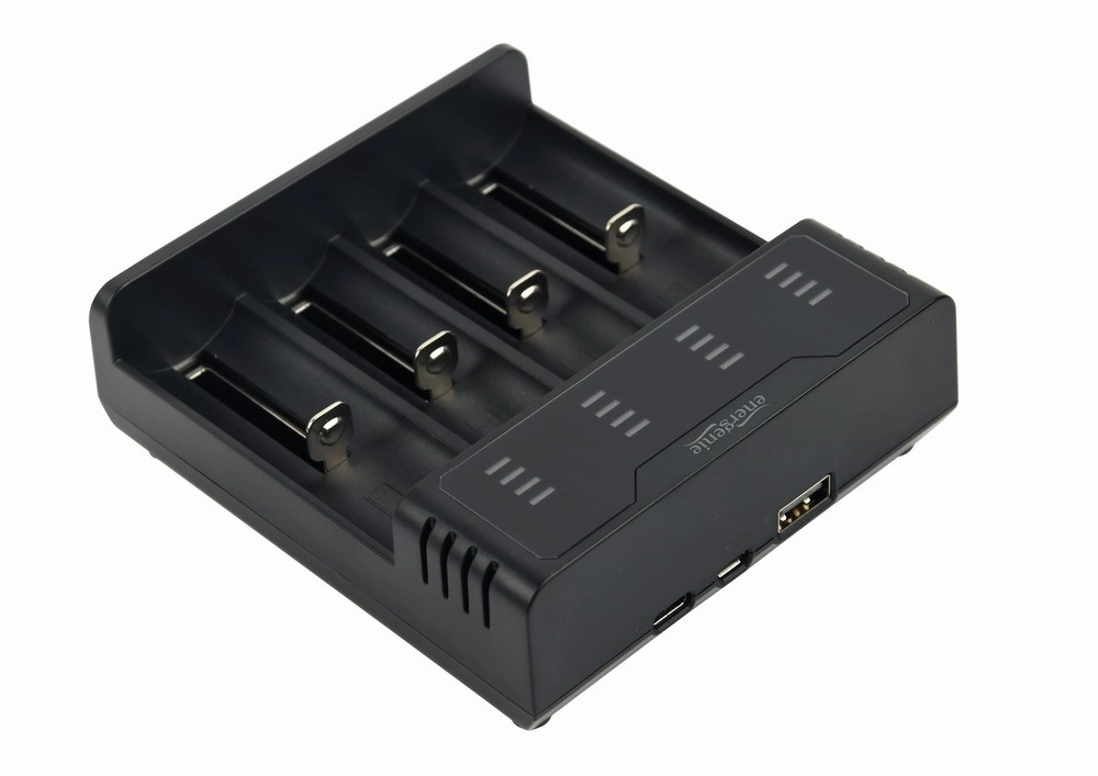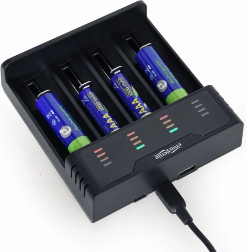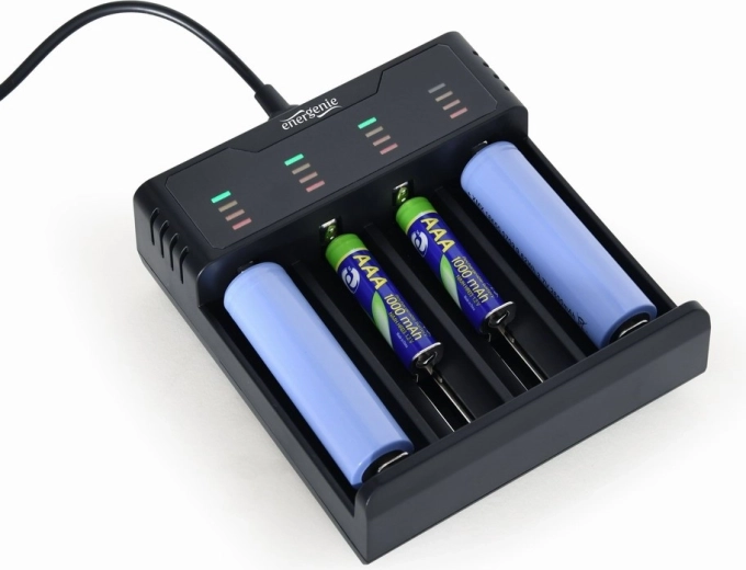 Universele USB‑oplader met vier onafhankelijke sleuven voor snel en eenvoudig opladen van zowel Ni‑MH‑ als Li‑ion‑accu’s. Biedt een compacte en lichte constructie, brede compatibiliteit met celformaten en betrouwbare bescherming tijdens het laden.