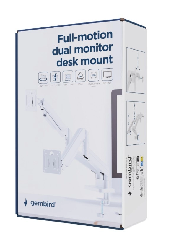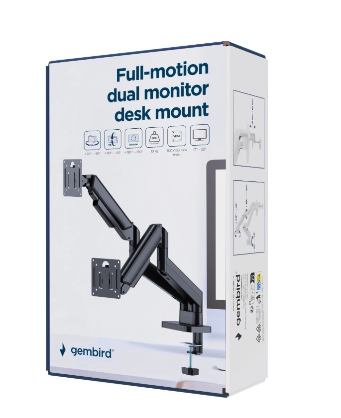Universele dubbele bureausteun voor monitoren met een schermdiagonaal van 17–32" en een draagvermogen tot 10 kg per arm. Biedt traploze hoogteverstelling met gasveer, draaien, kantelen en pivot naar portretmodus, en een sterke bureauklem voor veilige bevestiging. Geïntegreerd kabelbeheer houdt je bureau overzichtelijk.