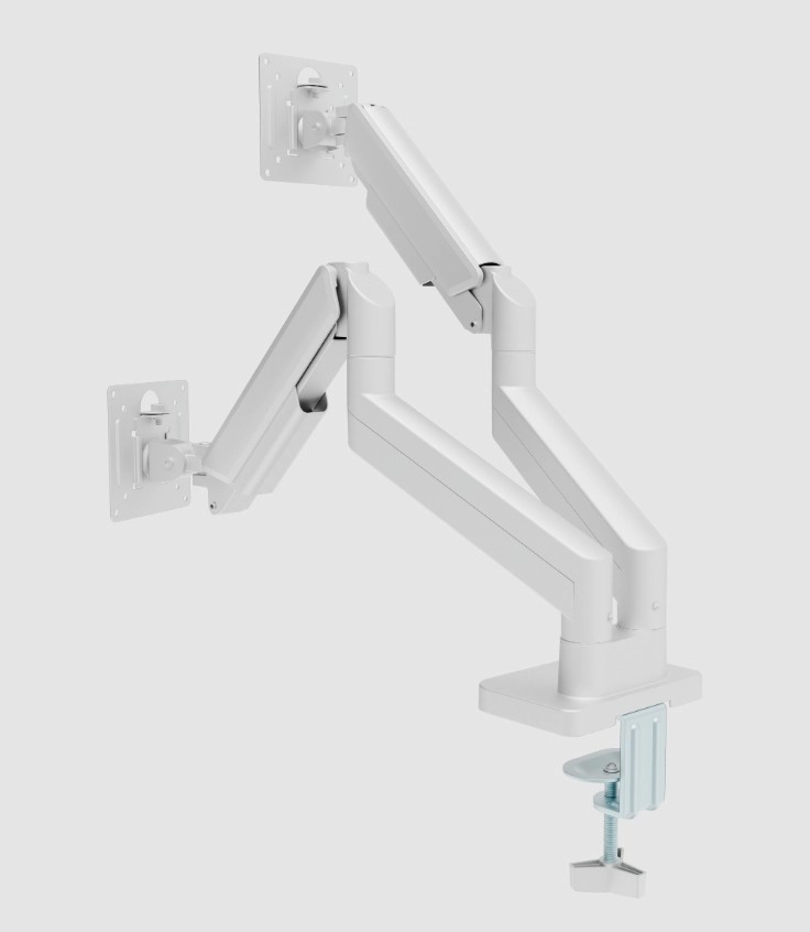 Verbeter de ergonomie en het overzicht op je werkplek. De dubbele arm maakt het eenvoudig om de positie van beide monitoren met één hand aan te passen – in hoogte dankzij de gasveren, zijwaarts, naar voren en naar achteren, met de mogelijkheid tot kantelen en 360° draaien voor werken in landschaps- en portretmodus. Compatibel met vrijwel elke LCD-monitor van 17–32" en de standaarden VESA 75×75 / 100×100 voor eenvoudige installatie.