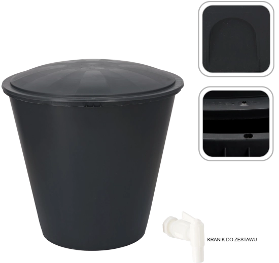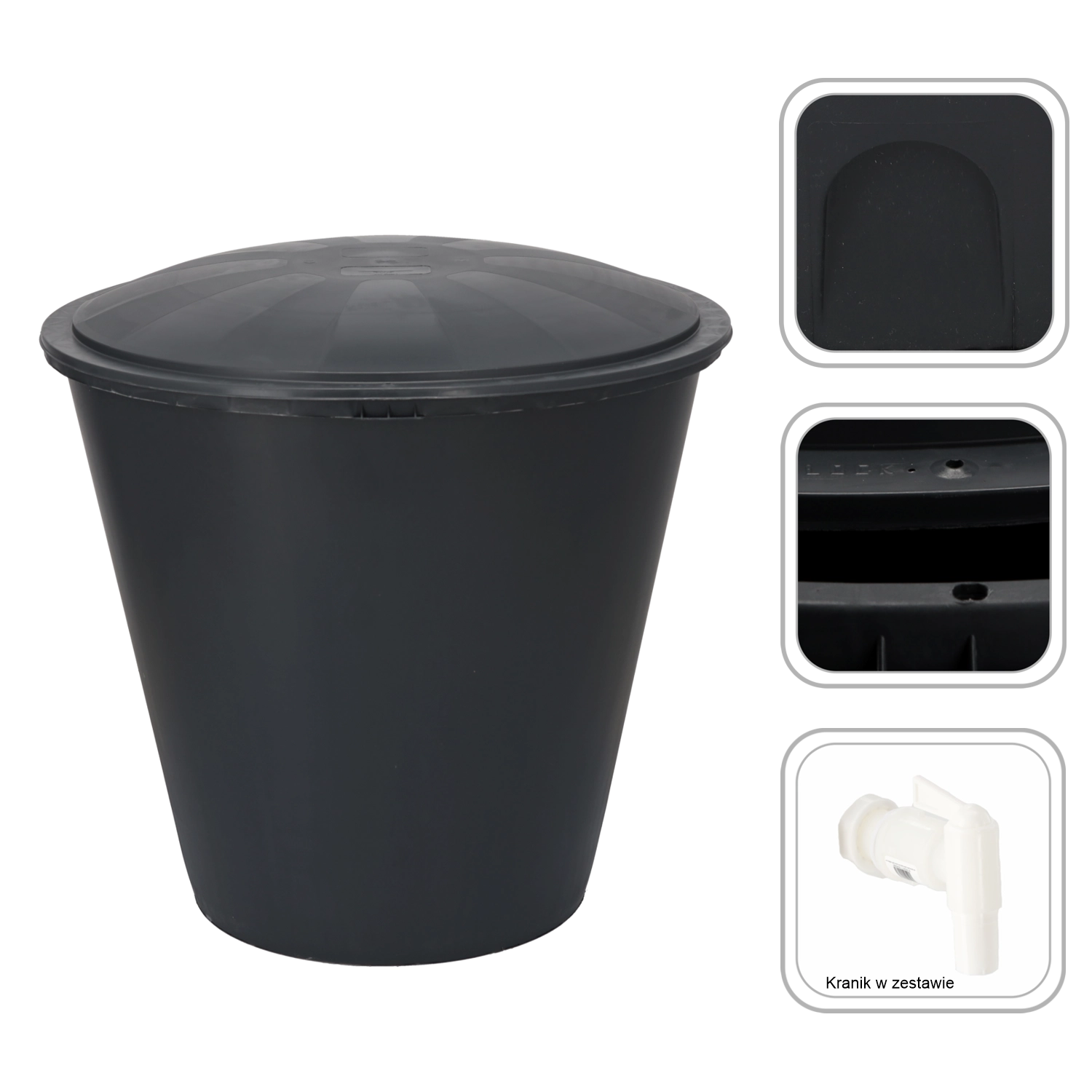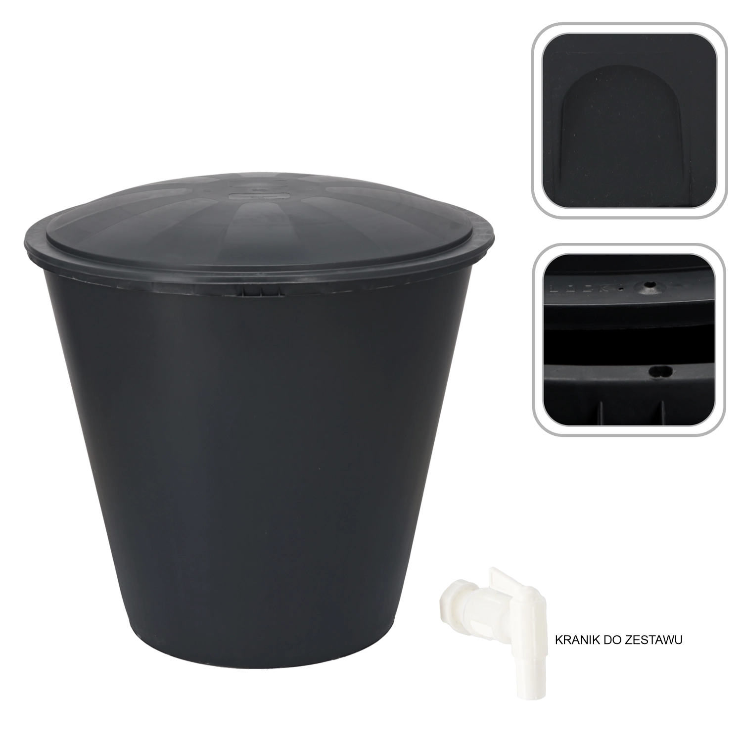 Ideaal voor het opvangen van water uit regenpijpen en het vervolgens gebruiken voor bewatering, het reinigen van buitenoppervlakken of het mengen van tuinpreparaten. De eenvoudige, conische vorm maakt hanteren en plaatsen op terras, erf of gazon gemakkelijk.