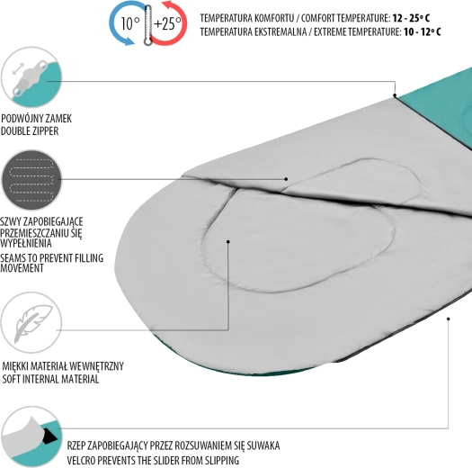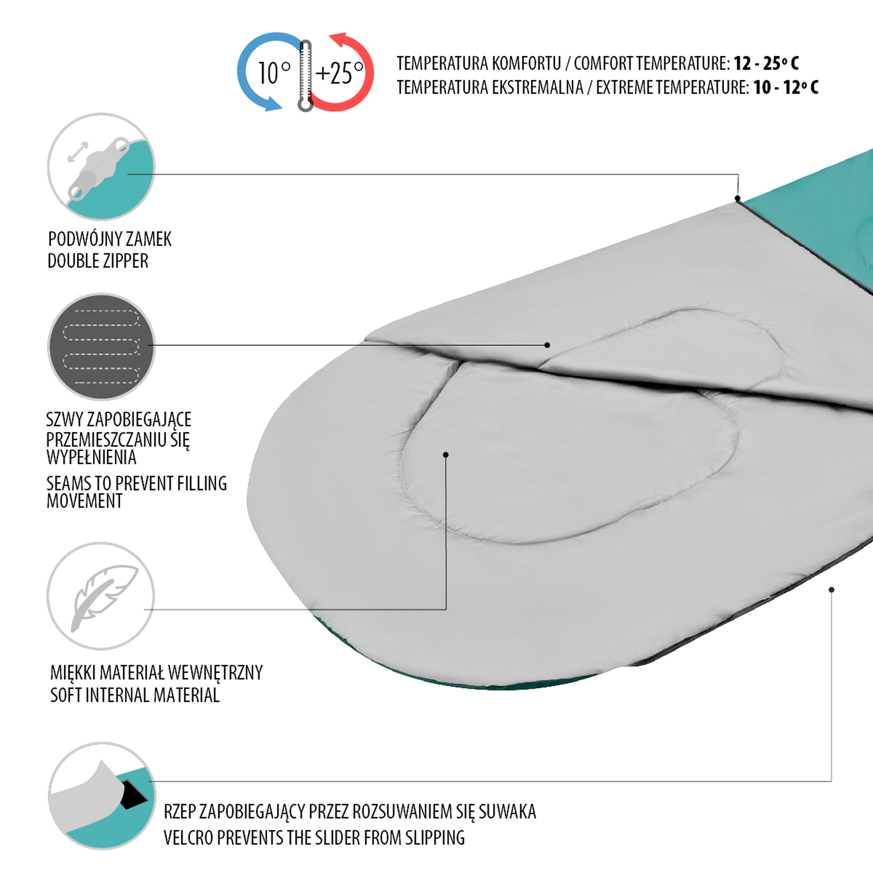Dankzij de lange rits aan de zijkant en onderzijde kan de slaapzak volledig worden geopend en als deken worden gebruikt, wat je zult waarderen tijdens warmere nachten. De ruime dekenconstructie biedt meer bewegingsvrijheid dan mummy-slaapzakken en de geïntegreerde overslag fungeert als praktisch hoofdkussen voor extra comfort. Inbegrepen is een compacte draagzak voor eenvoudig transport.