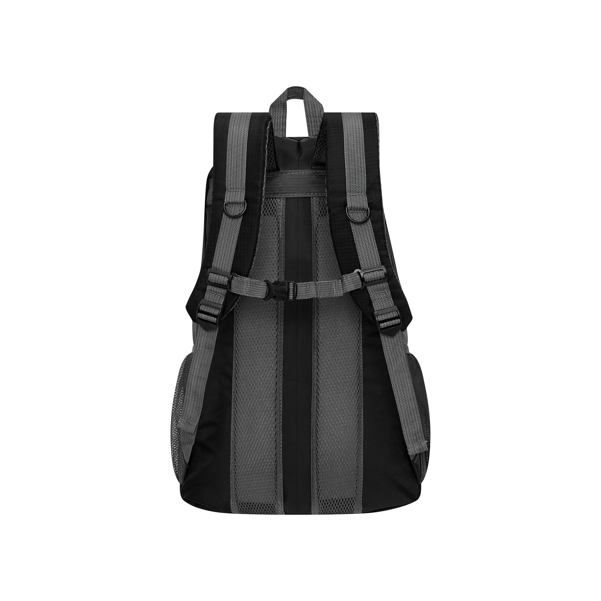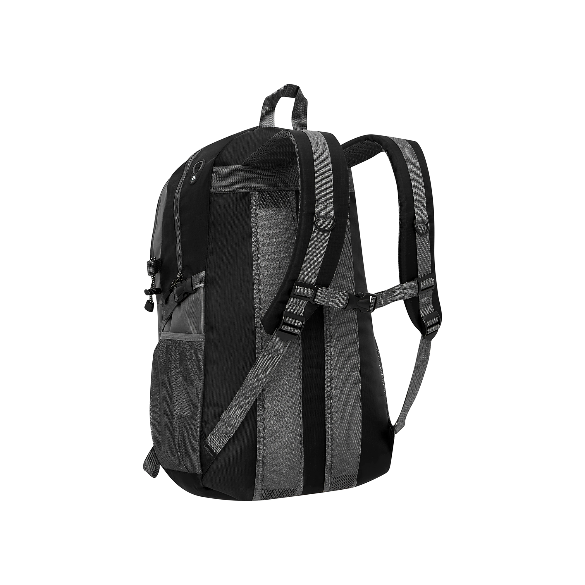 De verstelbare borstriem, gevoerde schouderbanden en compressieriemen verdelen de belasting gelijkmatig en houden de rugzak stevig tegen het lichaam.