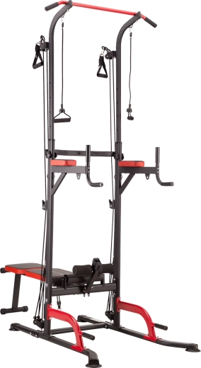 - 5-in-1: optrekstang, dipstation, bank, boven- en onderkatrol