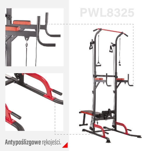 Met het HMS PWL8325-station train je effectief rug, borst, biceps, triceps en buikspieren. De constructie combineert een in hoogte verstelbare optrekstang, dipsteunen met armleuningen voor leg raises, lage steunen voor diepe push-ups en een verstelbare bank voor schuine en horizontale oefeningen met dumbbells. Er is een geïntegreerde haltersteun voor bench press en een stang van 120 cm inbegrepen.