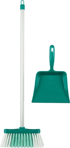 De lange steel van de bezem en de zachte haren laten kinderen veilig vegen nabootsen. De handveger met stoffer helpt kruimels en stof “op te vegen”.