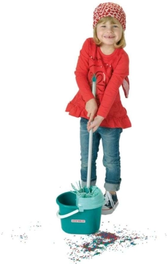 Kinderen kunnen “moppen” zoals volwassenen – de emmer heeft een geïntegreerde wringer, de mop is licht en ligt goed in de hand. Ideaal om schoonmaken na te spelen en de coördinatie te ontwikkelen.