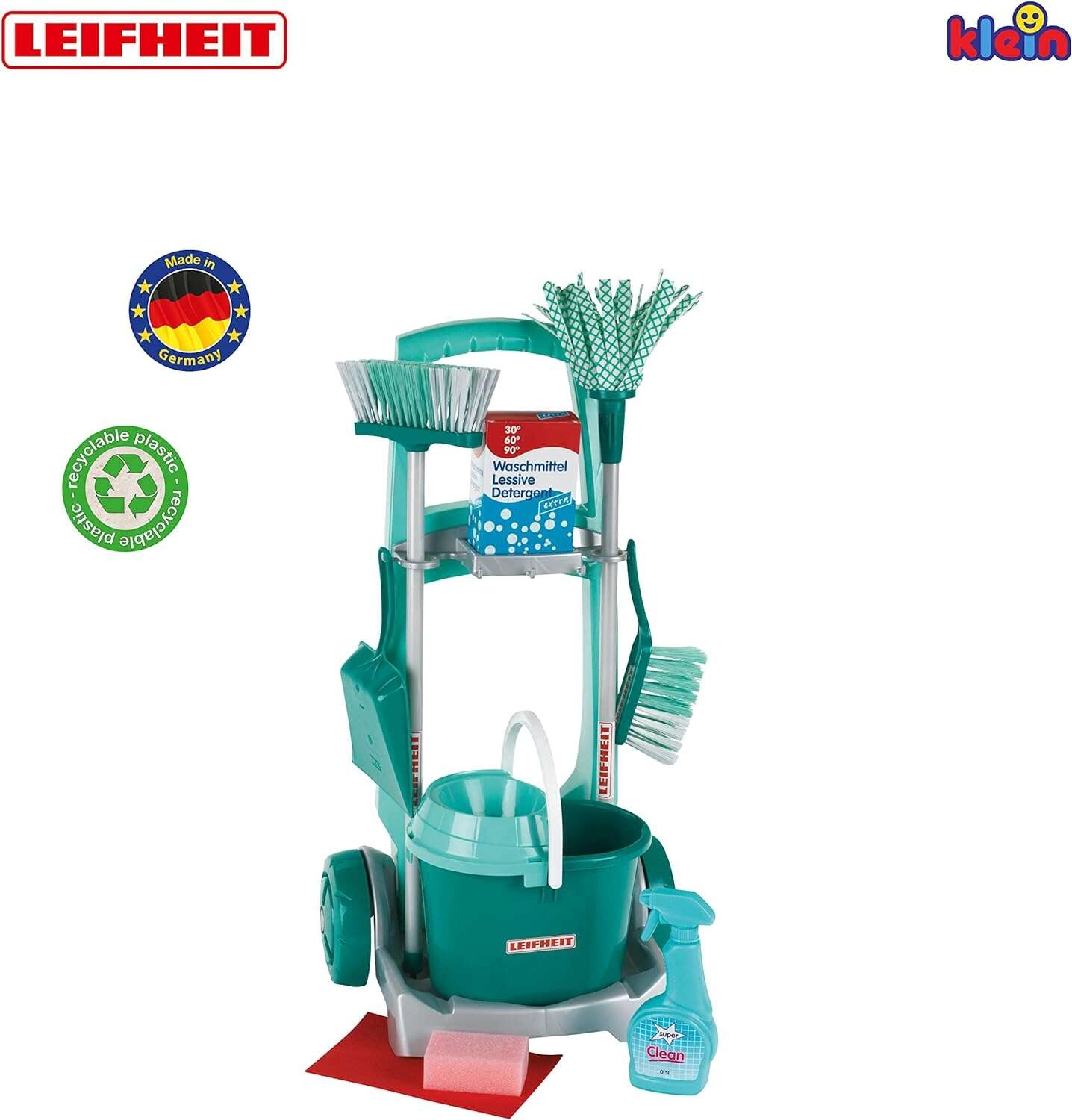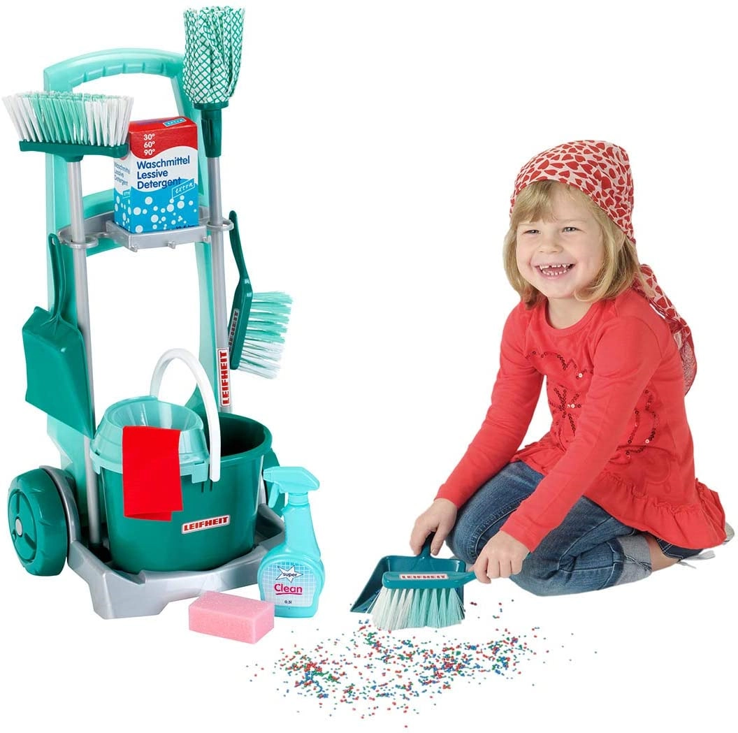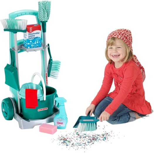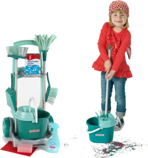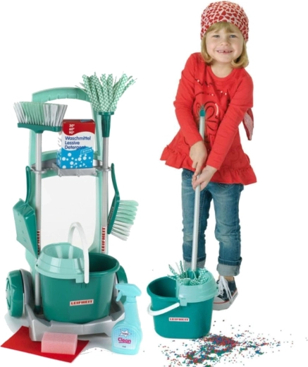 De kinder schoonmaakset met officiële LEIFHEIT-licentie lijkt op echt materiaal, maar is veilig aangepast voor kleine helpers. De robuuste wagen met wielen heeft houders voor gereedschap, een plank voor de emmer en plek voor een doosje met “detergent”, zodat kinderen zich voelen alsof ze echt schoonmaken.
