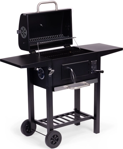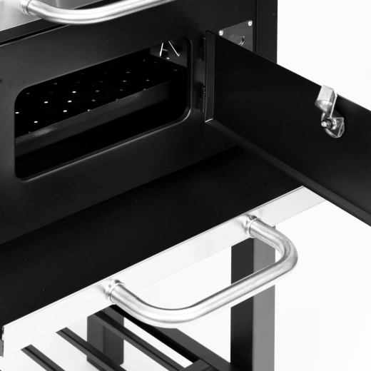 Het hoofdrooster van 45×33 cm wordt aangevuld met een bovenste opwarmrooster van 38×19 cm om bereide gerechten warm te houden. Twee zijplanken van 33×29 cm bieden ruimte voor kruiden en accessoires, en het onderste opbergrooster verbetert de organisatie. Dankzij de uitschuifbare aslade is het onderhoud snel en schoon, en de voorste deur van de vuurhaard vergemakkelijkt het bijvullen van houtskool tijdens het grillen.
