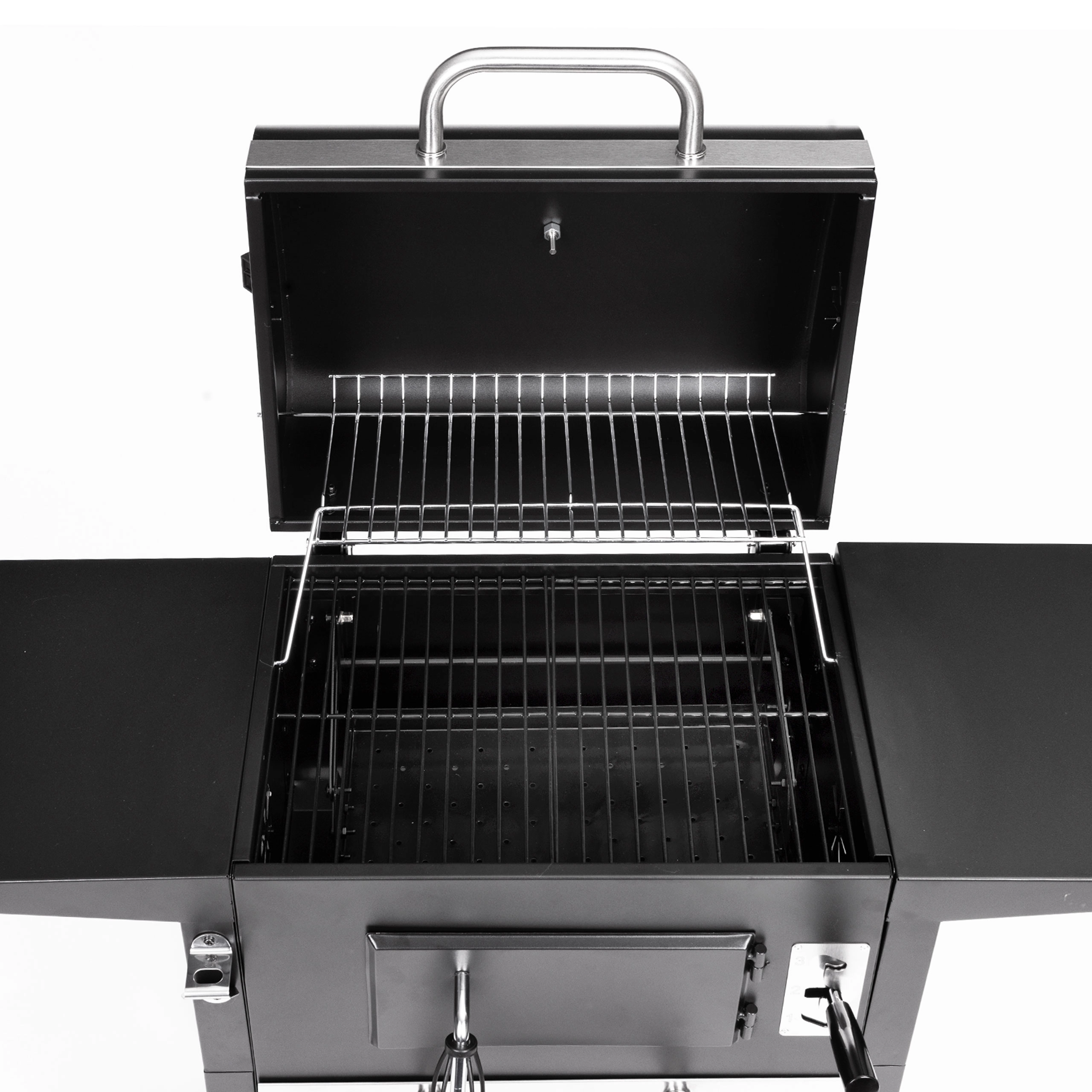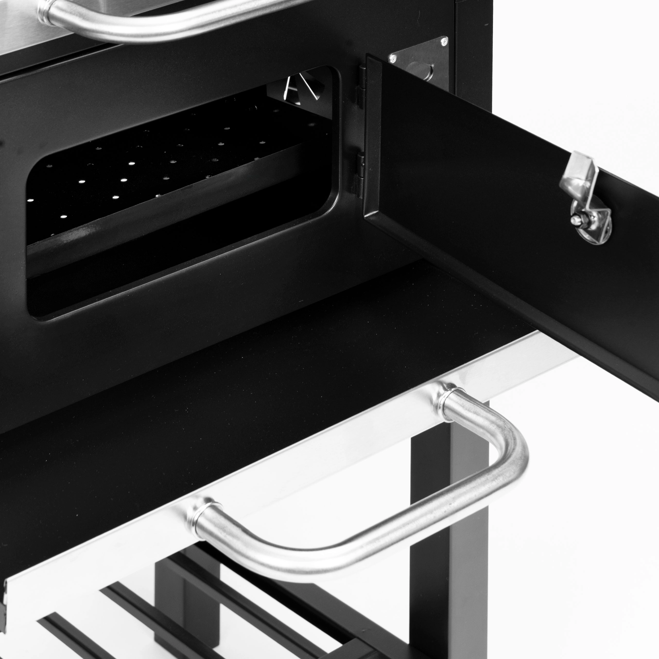 Uitschuifbare aslade voor snel schoonmaken, voorste deur voor het bijvullen van houtskool, twee zijplanken en een onderrooster voor perfecte organisatie.
