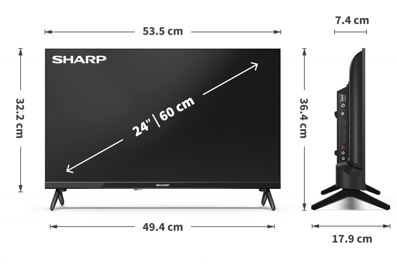 De compacte 24" SHARP-televisie is ideaal voor de slaapkamer, keuken of het vakantiehuisje. Biedt een helder LED-beeld, levendige kleuren en een slank design met stabiele pootjes voor plaatsing op een tafelblad. Een uitstekende keuze voor dagelijks TV-kijken, films en spelconsoles met weinig ruimtebeslag.