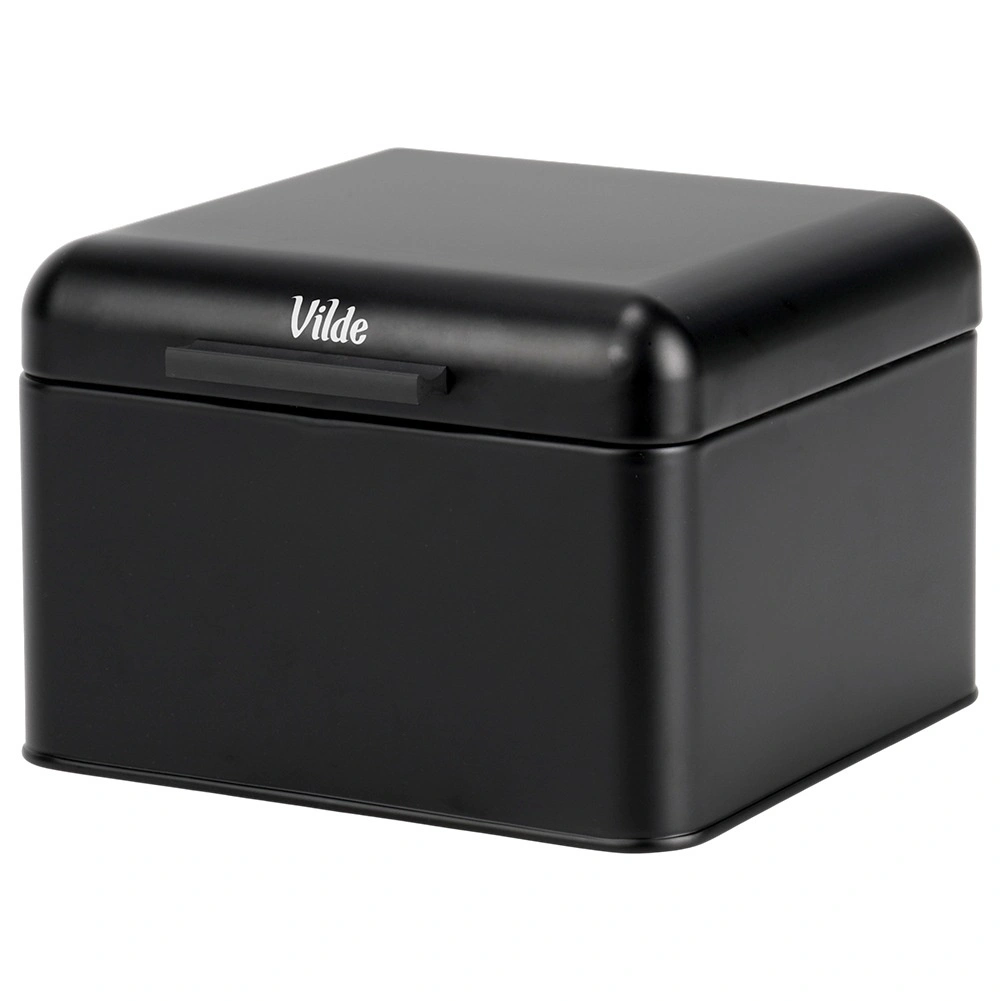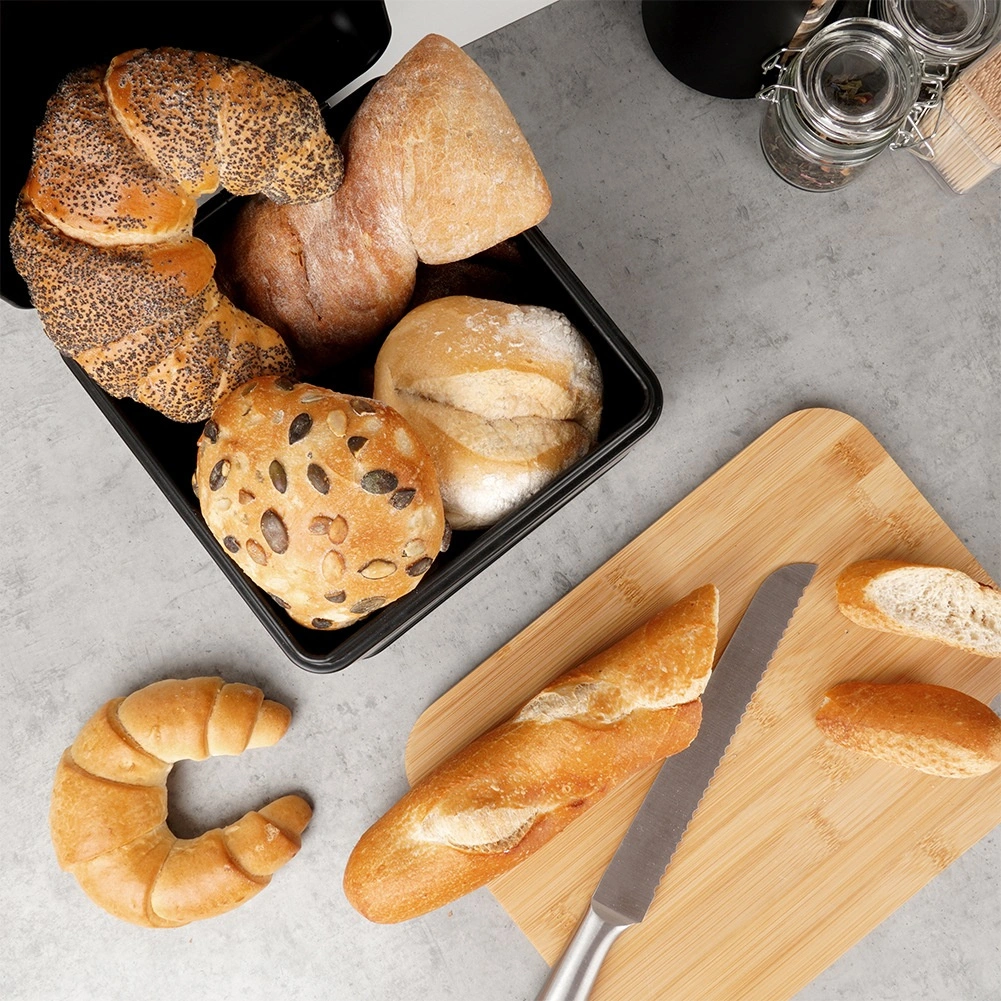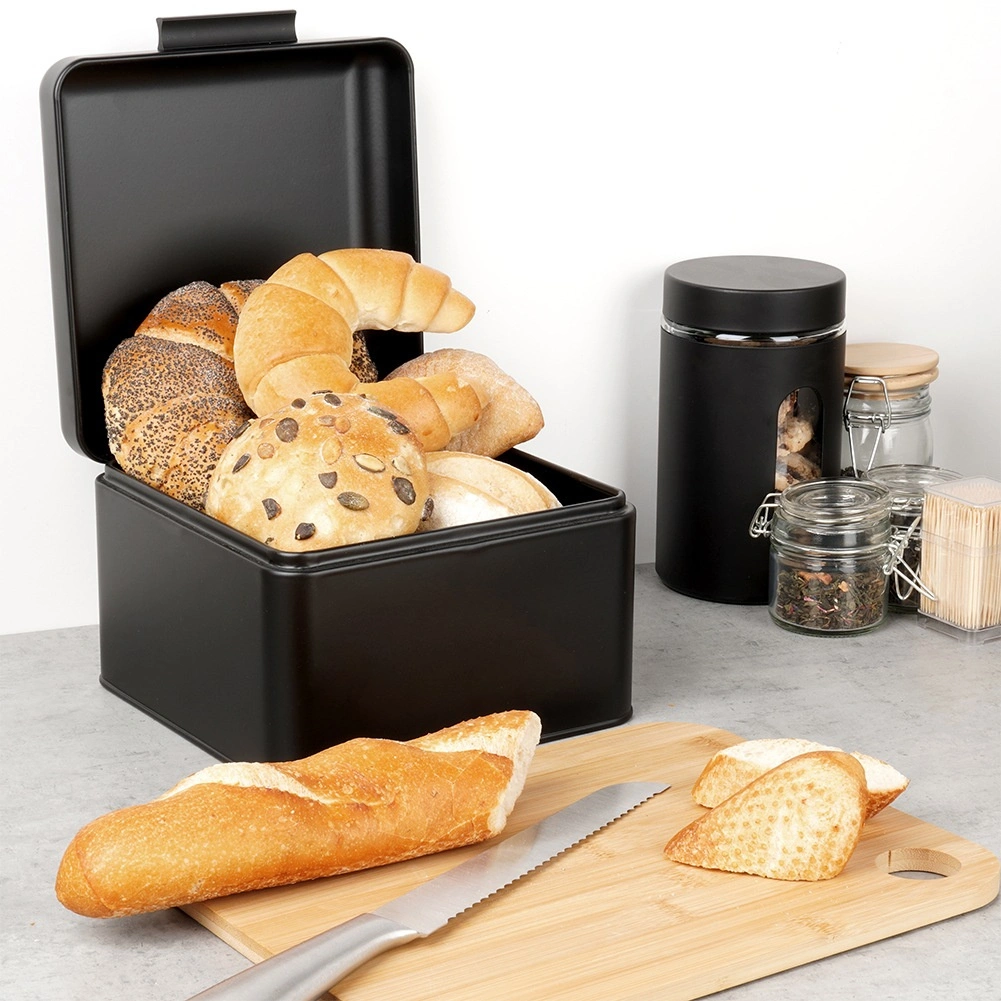 Praktische broodtrommel van duurzaam metaal in matzwarte uitvoering, ontworpen om brood en gebak langer smaakvol en knapperig te houden. Het deksel op stevige scharnieren is comfortabel te bedienen met de voorste greep en zorgt voor soepel openen en sluiten bij dagelijks gebruik.