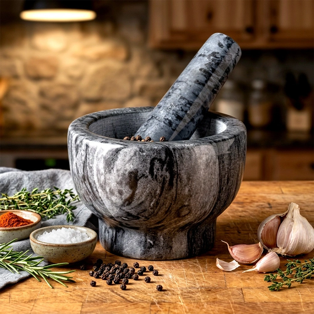 De massieve stenen uitvoering weerstaat intensief dagelijks gebruik en garandeert stabiliteit tijdens het pletten.