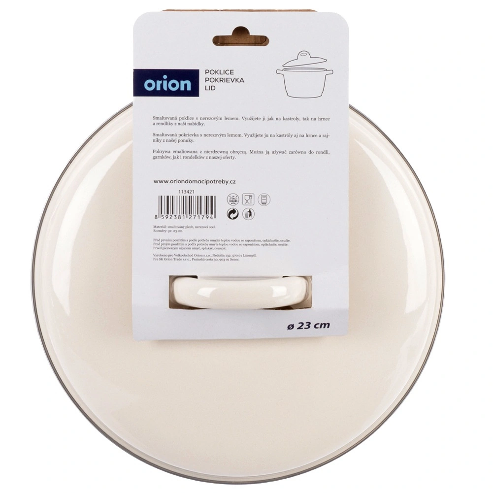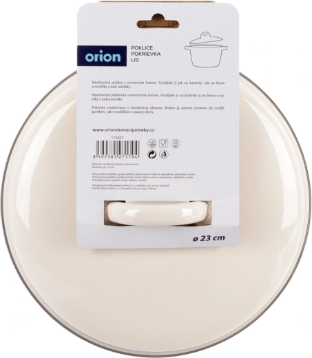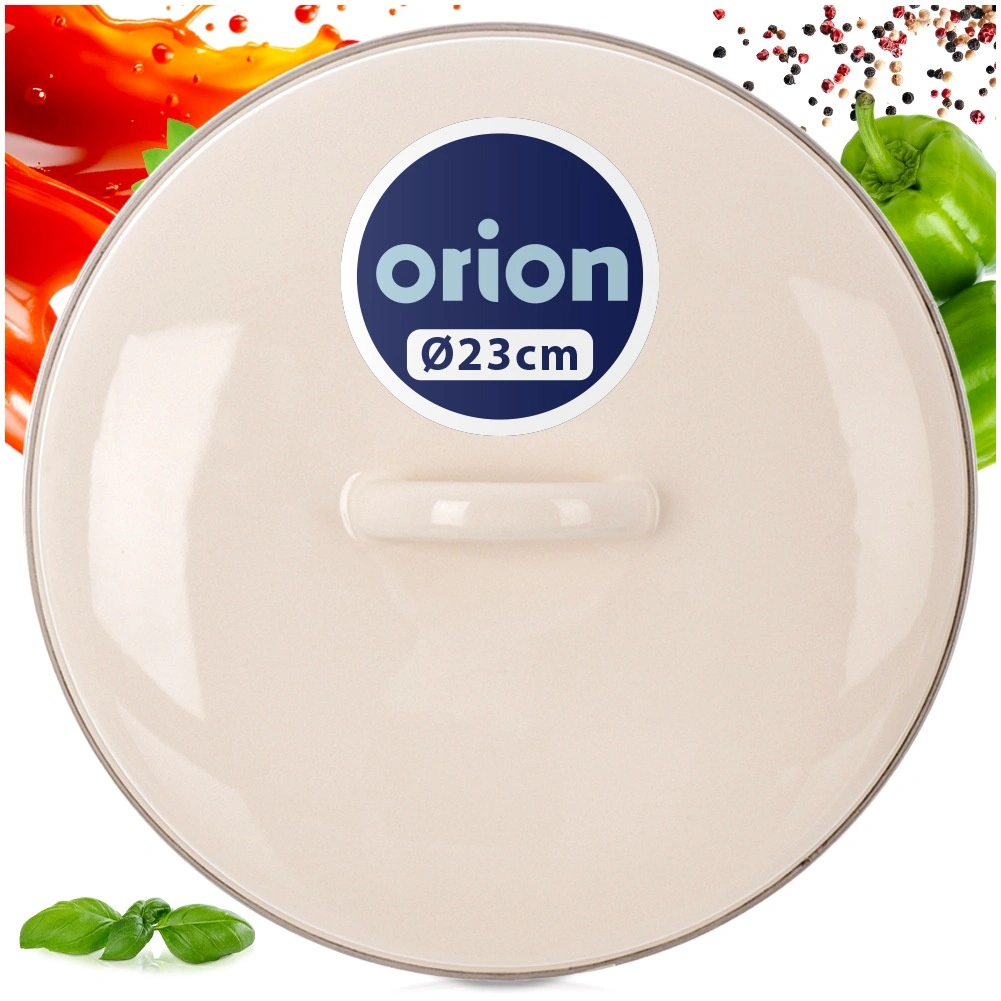 Universele crèmekleurige deksel met een diameter van 23 cm van geëmailleerd staal voor pannen, koekenpannen en steelpannen. Dankzij de metalen rand en de stevige greep sluit hij uitstekend af, versnelt het koken, bespaart energie en voorkomt spatten. Ook geschikt voor de vaatwasser en de oven.