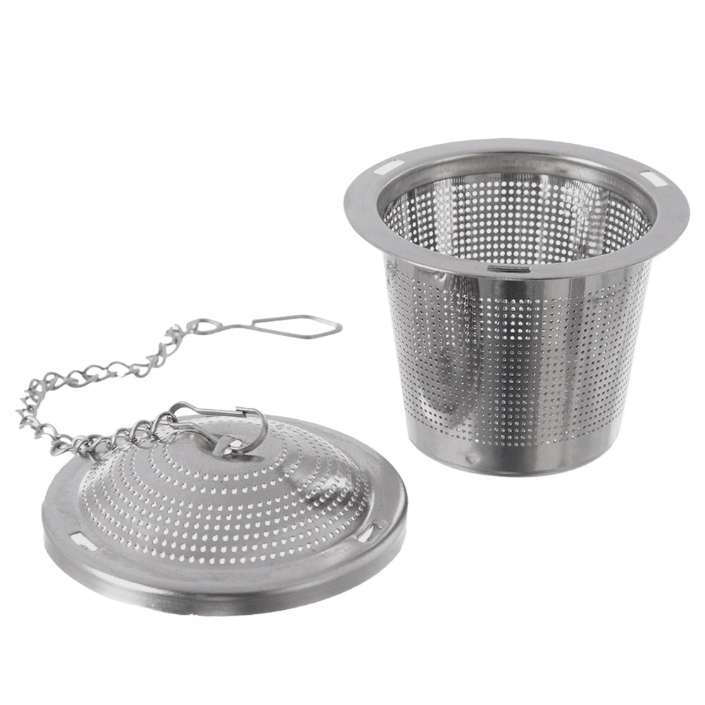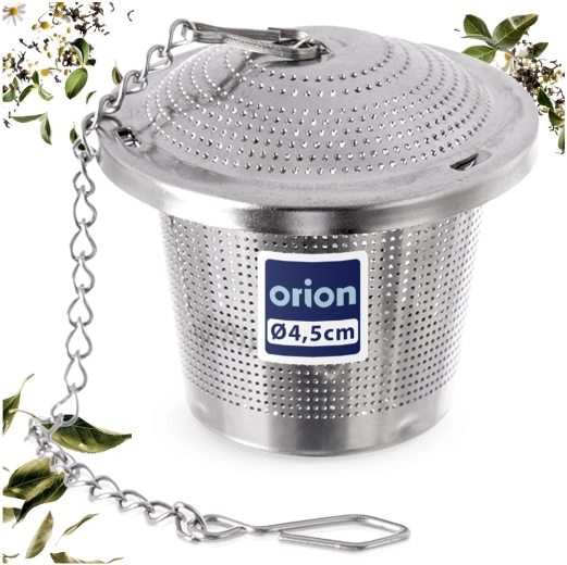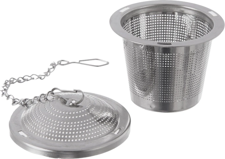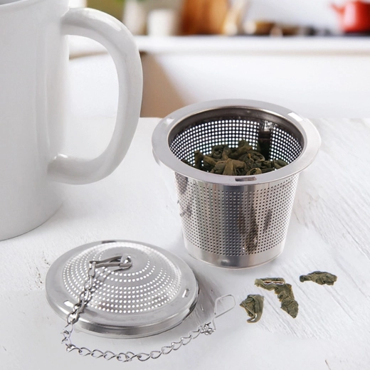 Praktisch roestvrijstalen theefilter met een diameter van 4,5 cm, voorzien van een fijn gaas en een kettinkje om op te hangen aan een beker of kop. Geschikt voor losse thee, kruideninfusies en gedroogd fruit, corrosiebestendig en gemakkelijk te reinigen – vaatwasserbestendig.