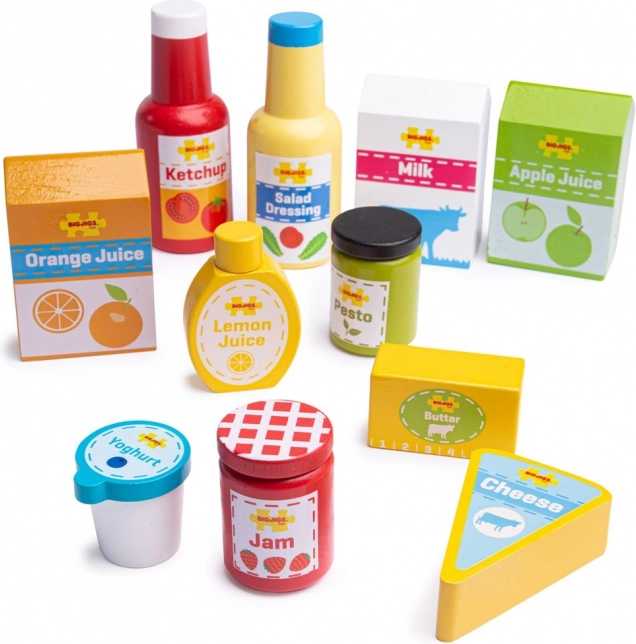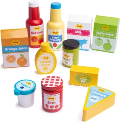 Deze verfijnde houten set bevat een selectie favoriete “houdbare” voedingsmiddelen – zoals ketchup, dressing, melk, appel-, sinaasappel- en citroensap, jam, boter, pesto, kaas en yoghurt. Realistische vormen en kleurrijke etiketten nodigen uit tot spel en leren kinderen spelenderwijs voedingsmiddelen herkennen en praten over gezond eten.