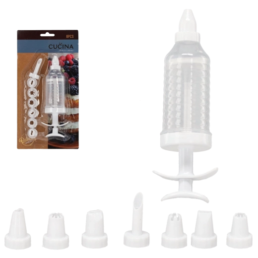 Praktische taartdecorator met 8 verwisselbare spuitmondjes, ideaal voor het decoreren van taarten, cupcakes, gebak en muffins. De ergonomische spuitvorm maakt eenvoudige en nauwkeurige applicatie van crèmes en glazuur mogelijk, perfect voor beginners en ervaren banketbakkers. Duurzaam kunststof en vaatwasserbestendig zorgen voor eenvoudig onderhoud en een lange levensduur.