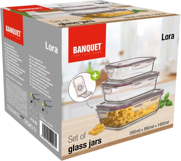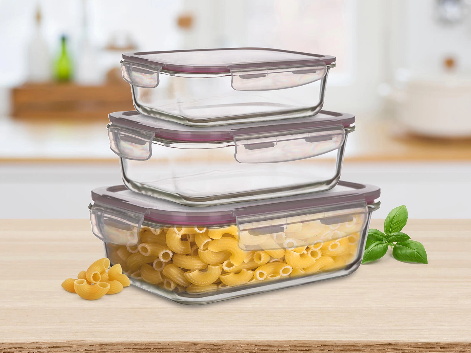 Praktische set van drie rechthoekige glazen Lora-dozen met transparante PP deksels en bordeauxrode afdichting houdt je etenswaren langer vers. De dozen zijn hermetisch afsluitbaar, geschikt voor de vriezer, magnetron en voor de oven zonder deksel. Ideaal voor bewaren, meenemen en opwarmen van gerechten.
