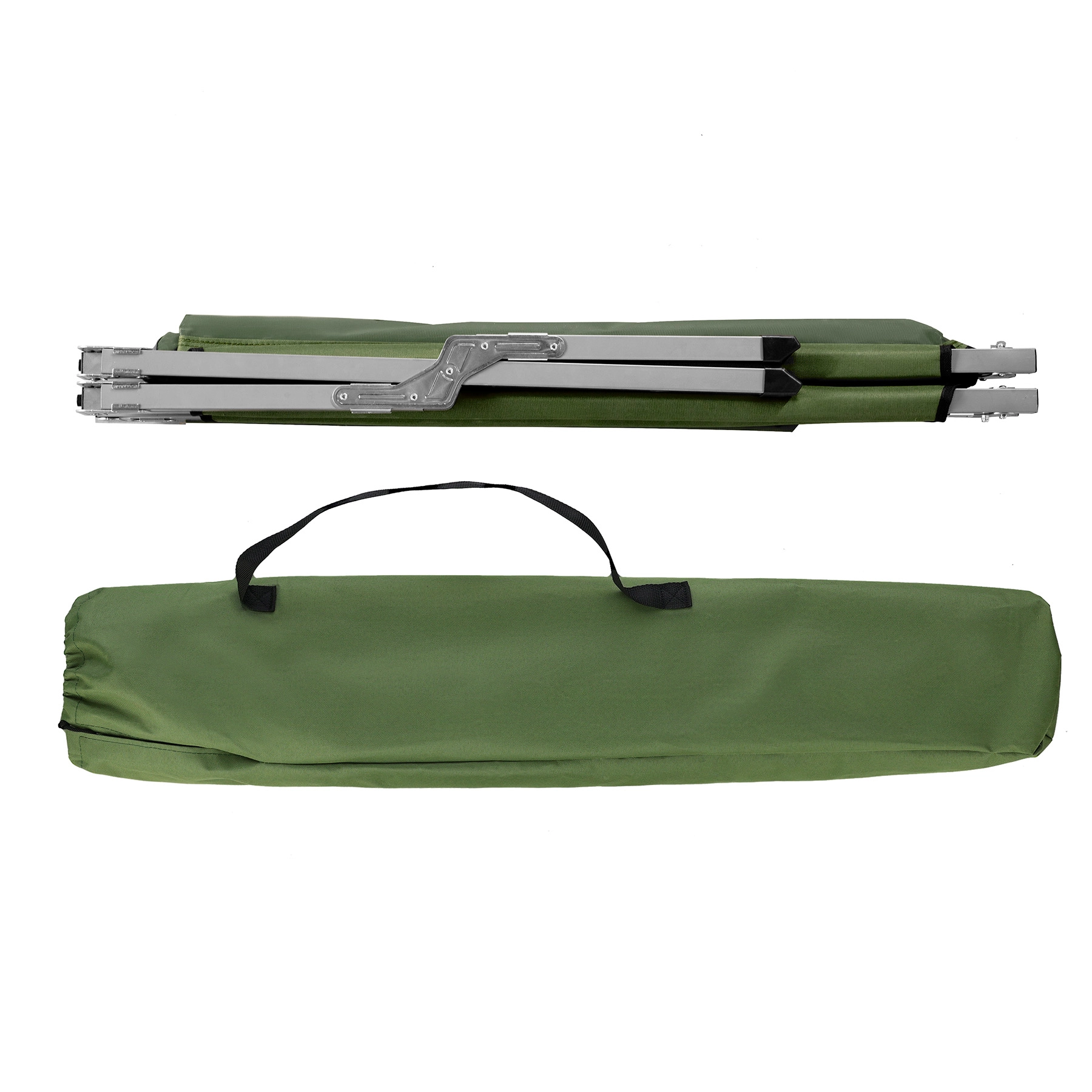 In opgevouwen toestand is het veldbed compact en past het in de meegeleverde tas met rits en schouderriem – eenvoudig op te bergen en mee te nemen.