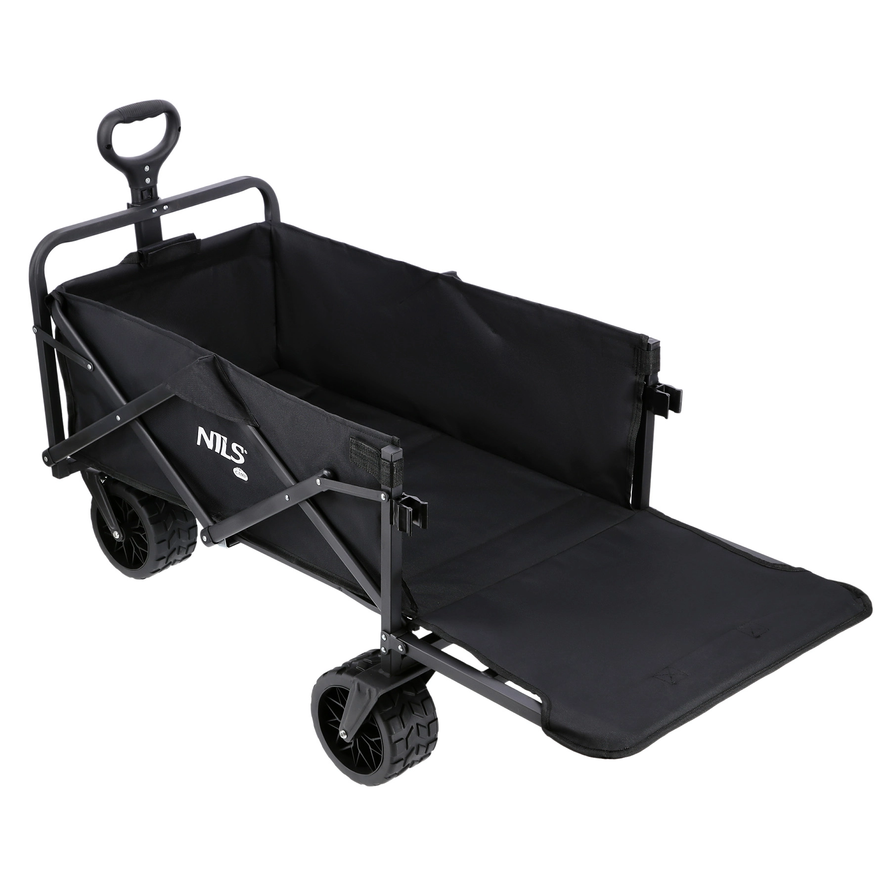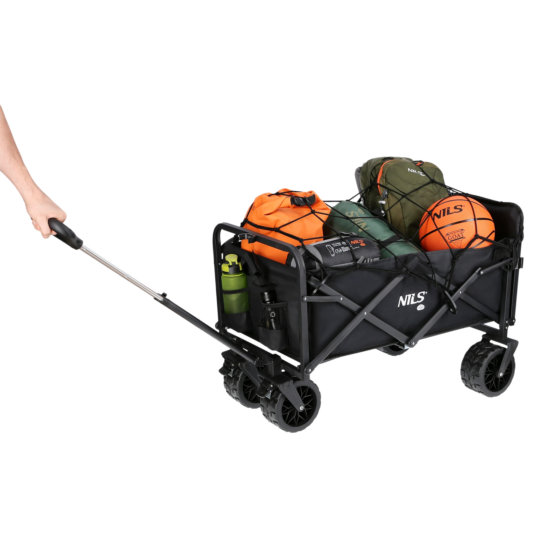 De praktische opvouwbare wagen NILS Camp NC1608 is de ideale hulp voor strand, camping en festivals. Hij biedt een inhoud van 160 l, een draagvermogen tot 100 kg, een telescoophandgreep voor gemakkelijk manoeuvreren en brede 7" wielen voor soepel rijden, zelfs op zand. Het te openen achterpaneel, drankhouders en een binnenvak zorgen voor perfecte organisatie. Dankzij het snelle inklappen, de vergrendeling en de meegeleverde tas is hij eenvoudig te vervoeren en op te bergen.