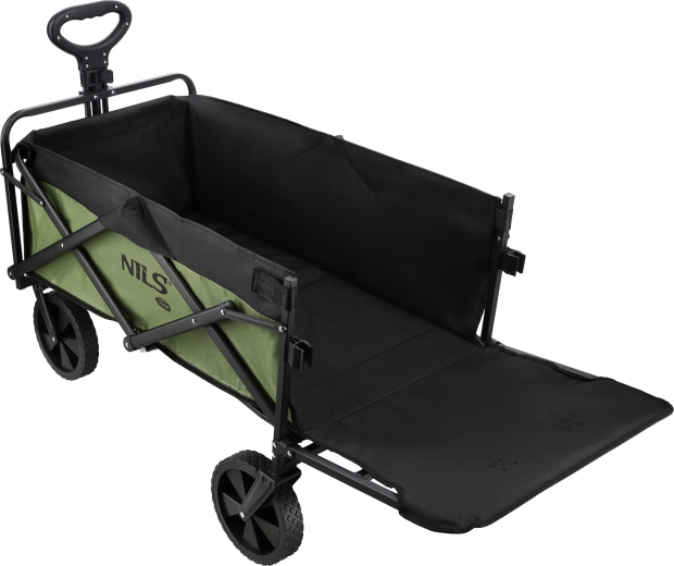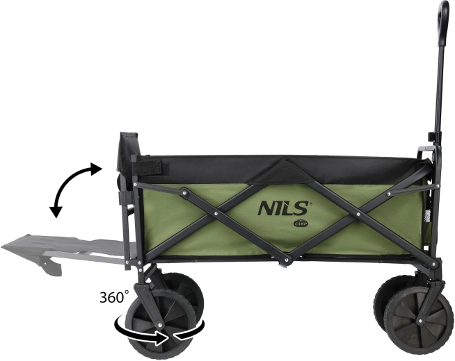 De praktische opvouwbare wagen van NILS Camp met een inhoud van 150 l vergemakkelijkt het vervoeren van boodschappen, kampeeruitrusting en strandspullen. Dankzij de robuuste wielen, het stalen frame en een max. draagvermogen van 100 kg kan hij over uiteenlopend terrein rijden en blijft hij eenvoudig te bedienen met de telescopische handgreep. Na gebruik vouwt u hem in een oogwenk compact op voor gemakkelijke opslag in de auto of thuis.