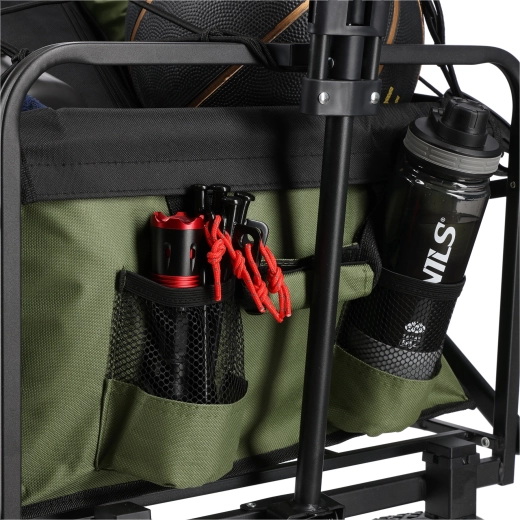 De grote wielen van PP/PVC (19 × 4 cm) zorgen voor een stabiele en soepele rit op zand, gras en bestrating. De telescopische handgreep past zich aan uw lengte aan en de neerklapbare achterwand vergemakkelijkt het laden en lossen. Twee meshvakken houden een fles of kleine spullen binnen handbereik.