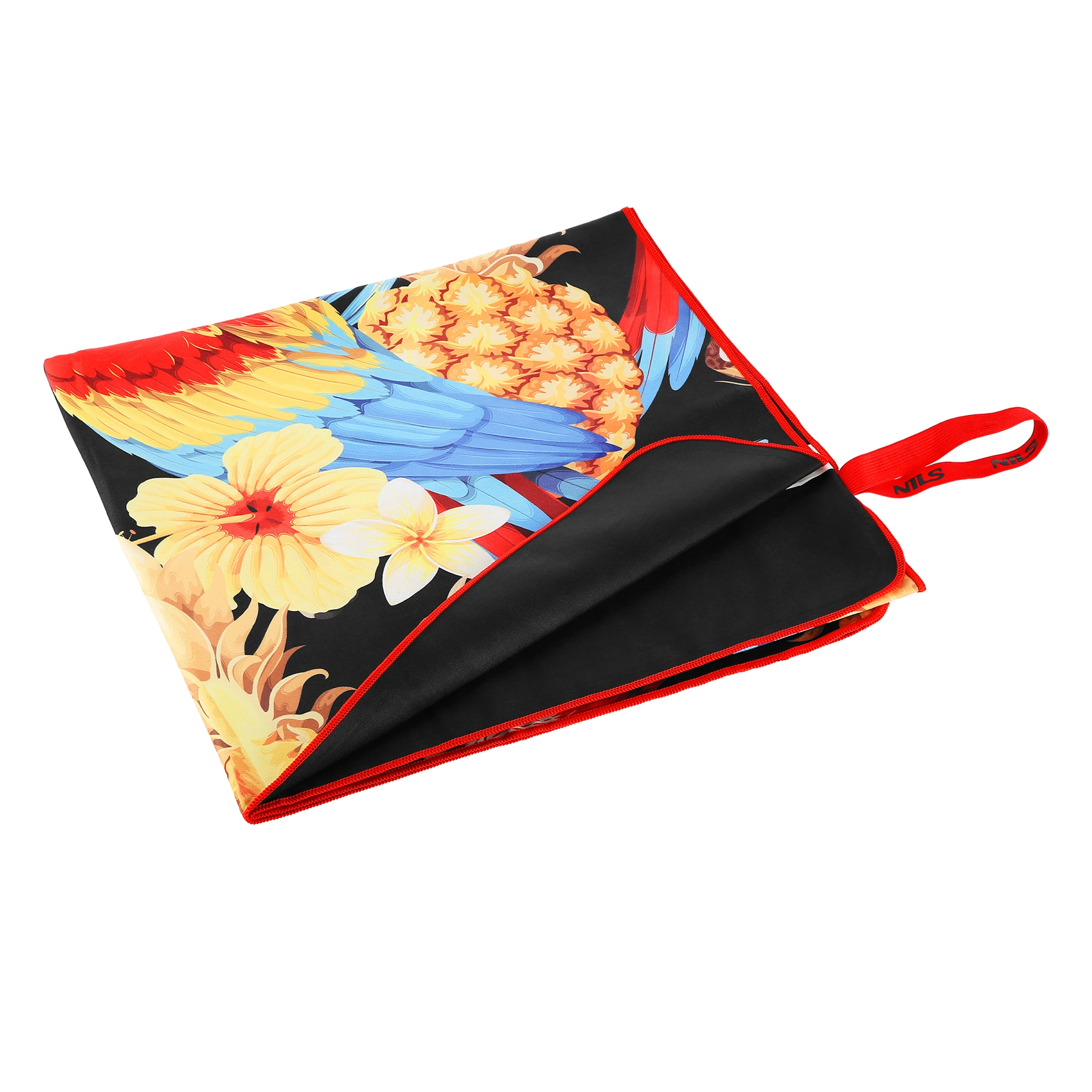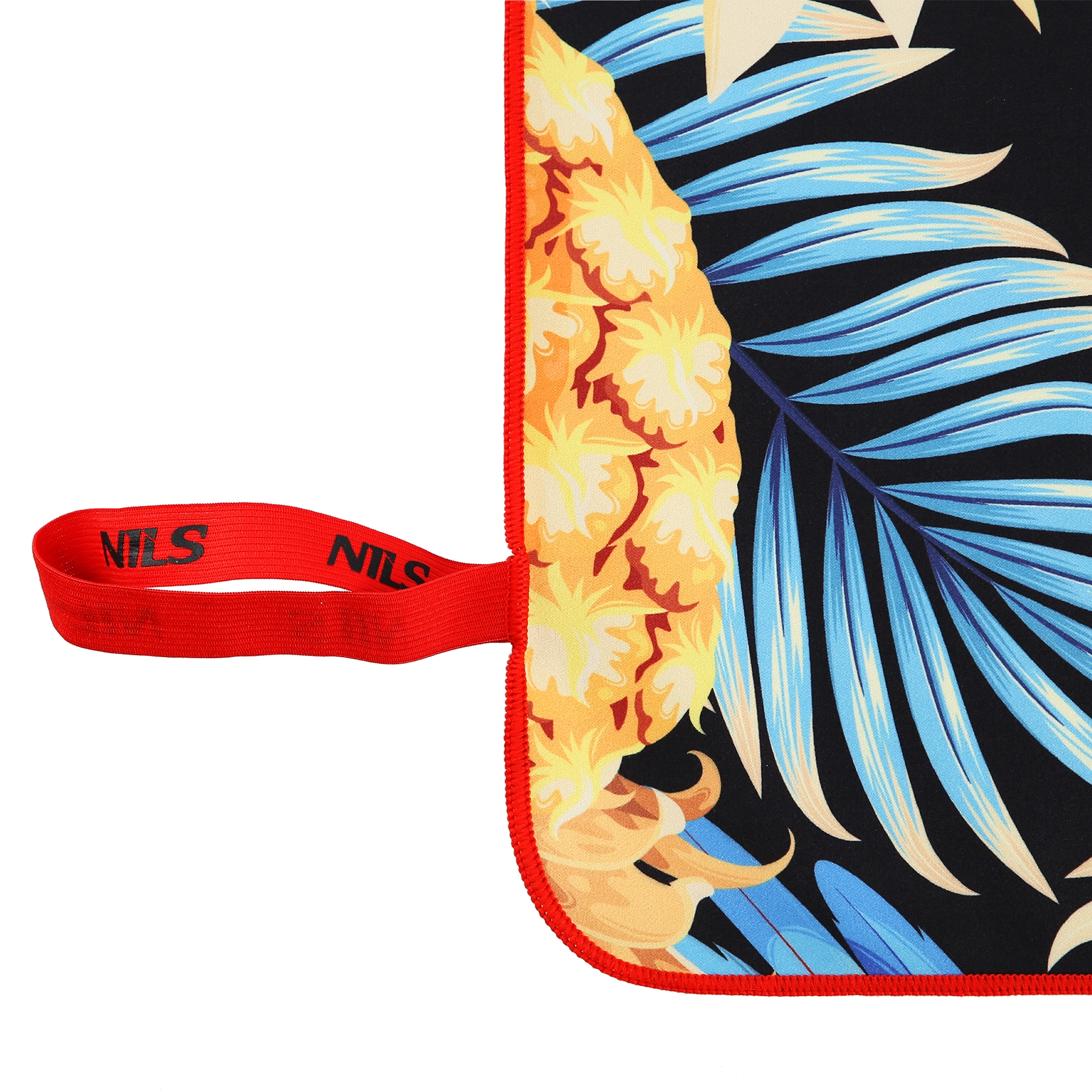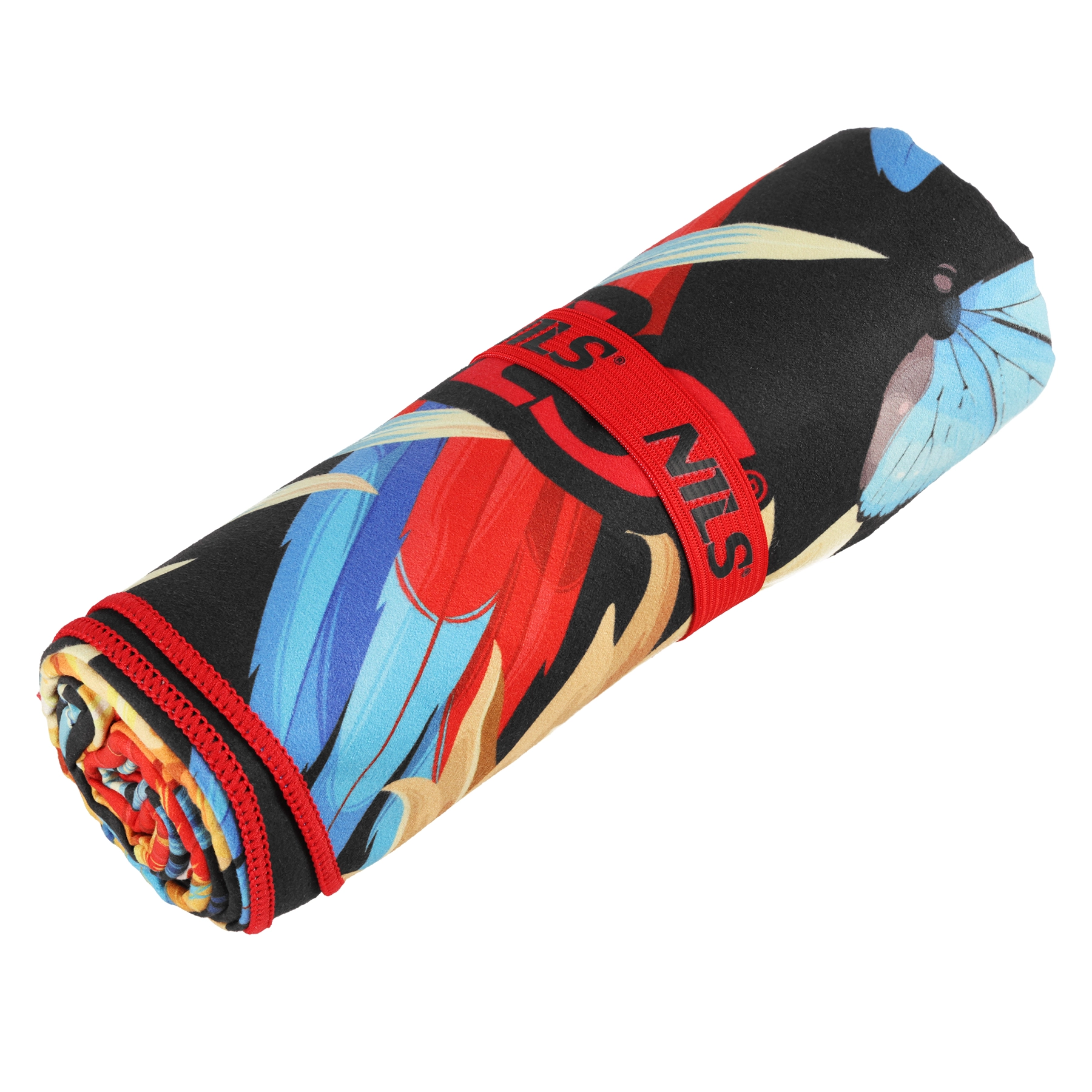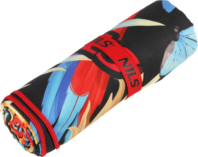 Na het opvouwen fixeer je de handdoek met de elastische NILS-band, waardoor hij minimaal ruimte inneemt in rugzak of tas en netjes opgeborgen blijft.