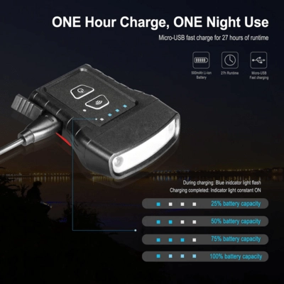 De geïntegreerde Li‑ion 3,7 V / 500 mAh accu wordt via USB opgeladen en biedt flexibele gebruiksduur afhankelijk van de gekozen stand. De bediening is intuïtief: één knop voor het wisselen van standen, een tweede knop voor het activeren van de bewegingssensor. Een ideale keuze voor hardlopen, kamperen, wandelen en werken in het veld.