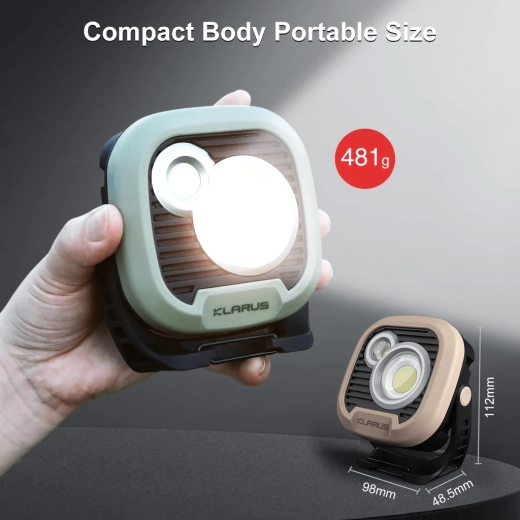 De compacte oplaadbare werk- en kampeerlamp Klarus WL3 biedt een lichtstroom van 1500 lm, traploze instelling van de wittemperatuur (2700–6500 K) en intensiteit, een rode COB‑LED voor ongestoorde verlichting, een hoogcapaciteitsaccu van 13.500 mAh met powerbank-functie en IPX5-bestendigheid. Opladen via USB‑C, 180° draaibare kop en meerdere bevestigingsopties voor maximale flexibiliteit.