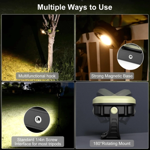 De geïntegreerde li‑ion-accu 13.500 mAh (3,7 V) zorgt voor een uitzonderlijk lange werktijd – tot 158 uur, afhankelijk van de modus. Het handige USB‑C versnelt het opladen en de powerbank-functie houdt je telefoon of andere elektronica draaiende. De 180° draaibare lichtkop en meerdere montageopties (magneetvoet, haak, schroefdraad voor statief) maken het eenvoudig om het licht precies te richten waar je het nodig hebt.