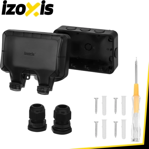 - IZOXIS dubbele wandcontactdoos, montageschroeven, pluggen, kabelwartels, afdopjes, spanningszoeker, verpakking