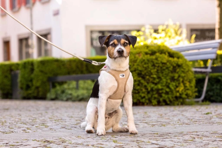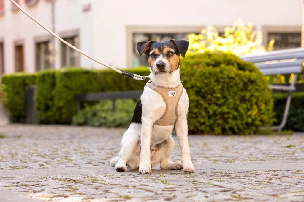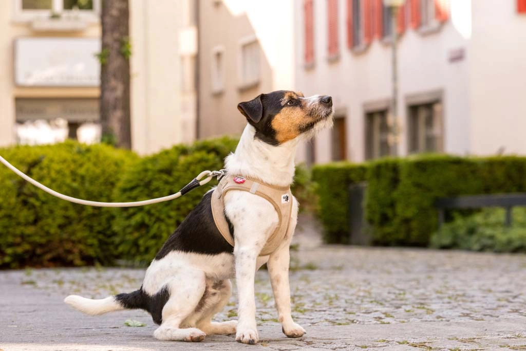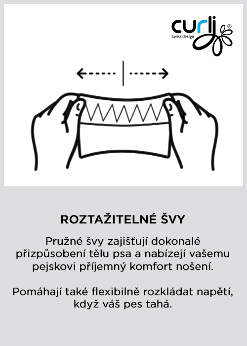 De lichte Air‑Mesh voering voert warmte en vocht af. Gekruiste banden en elastische naden verdelen de trekkracht weg van de nek en passen zich aan de anatomie van de hond aan.