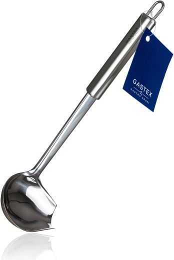 Praktische AZORA sauslepel van roestvrij staal met een lengte van 29,5 cm, ideaal voor professionele én thuiskoks. Voorzien van een ophangoog, eenvoudig te onderhouden en vaatwasmachinebestendig. Het tijdloze, functionele design uit de GASTEX-lijn garandeert lange levensduur en betrouwbaarheid bij dagelijks gebruik.