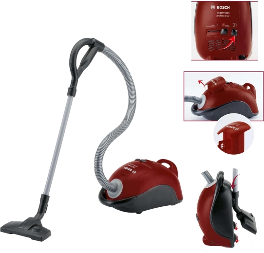 Realistische kinderstofzuiger met BOSCH-licentie van het merk Klein biedt kinderen leuk en veilig schoonmaakspeelgoed. Hij heeft een rode uitvoering met zwarte details, geluidseffecten zoals een echte stofzuiger en een werkende opzuigfunctie voor granulaat in een transparant reservoir. Dankzij de wieltjes, comfortabele handgreep en het lichte ontwerp is hij makkelijk te bedienen en stimuleert hij rollenspel en de fijne motoriek.