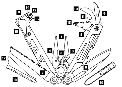 Tang, zaag, 420HC mes, bits, hamertje en meer – alles met vergrendeling en binnen seconden klaar voor actie.