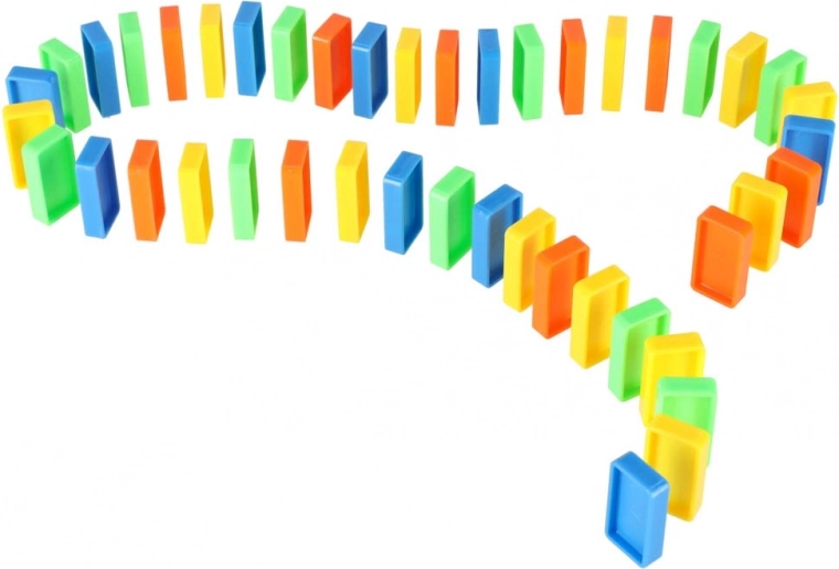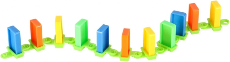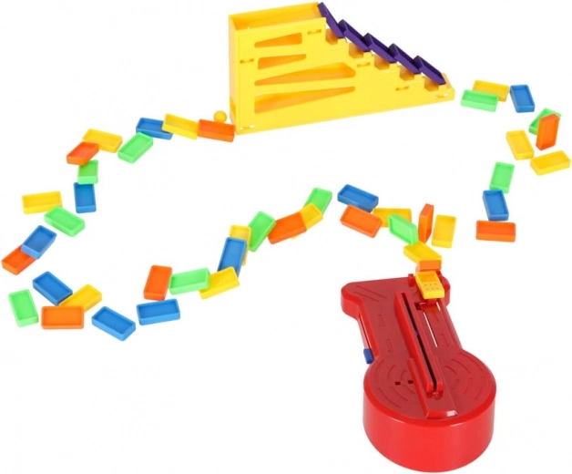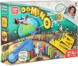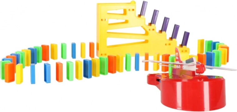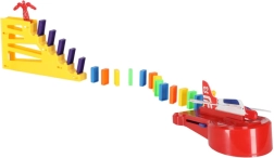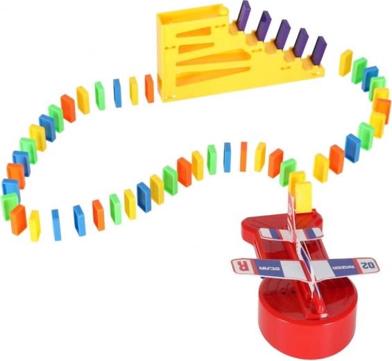 Inhoud van de verpakking: 126× dominostenen (4 kleuren), 2× vliegtuig met lanceerder, baandelen, 2× knikker, 1× figuurtje, 12× dominostandaard, 52× educatieve stickers (letters, cijfers, wiskundige tekens).