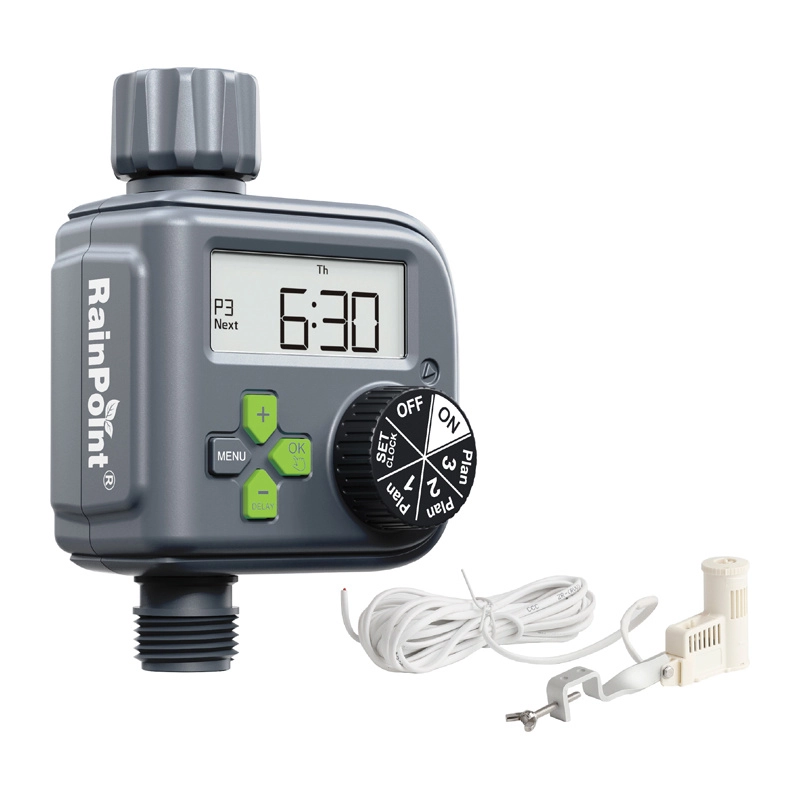 De geïntegreerde bekabelde regensensor pauzeert alle cycli bij neerslag en hervat het programma automatisch nadat het is opgedroogd. Zo wordt overbewatering van bedden geminimaliseerd en het waterverbruik geoptimaliseerd.