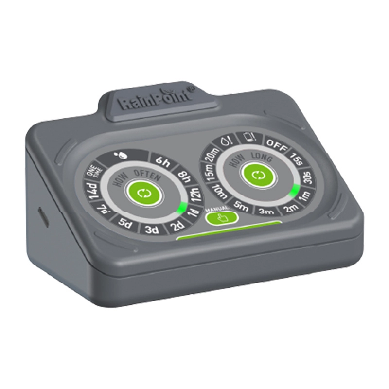 Eenvoudige bediening laat je de looptijd van 15 s–20 min en de frequentie van 6 uur tot 14 dagen kiezen, of eenmalig starten. LED‑indicatoren bewaken de werking en een laag waterniveau; een terugslag- (anti‑sifon) klep en filter beschermen het systeem tegen verontreinigingen.