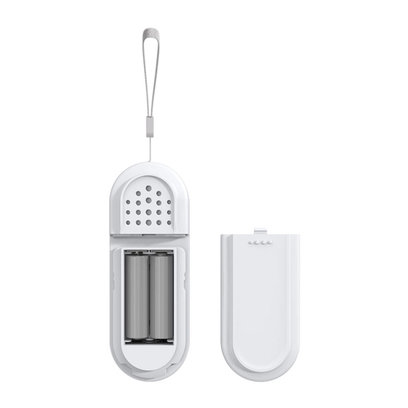 De lichte sensor met praktische lus hang je eenvoudig op of zet je neer. Batterijvoeding maakt flexibele plaatsing mogelijk.