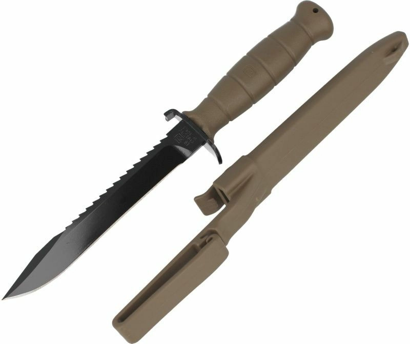 Universeel survivalmes GLOCK FM81 Dark Earth met vast lemmet en zaag op de rug is een betrouwbare hulp voor bushcraft, outdoor en tactisch gebruik. Het biedt veergehard koolstofstaal met een zwarte antireflectieafwerking, een duurzame polymeerhandgreep met zekere grip en een kunststof schede voor veilig dragen.