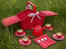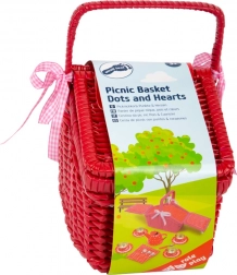 De betoverende picknickmand met stippen- en hartjesmotief bevat een metalen theeservies, klaar voor elke denkbeeldige theeparty. De stevige uitvoering met verstelbare klittenbandriempjes en textiele rand maakt het eenvoudig om alle onderdelen te dragen en op te bergen. Kinderen oefenen sociale interactie, motoriek en creativiteit.