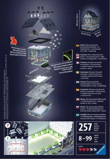 Ontdek spannende fun met de 3D-puzzel Ravensburger Spookhuis. 216 stevige stukjes vormen na het leggen een stabiel model dat in het donker oplicht en uren plezier en logische training biedt voor kinderen vanaf 8 jaar en volwassenen.
