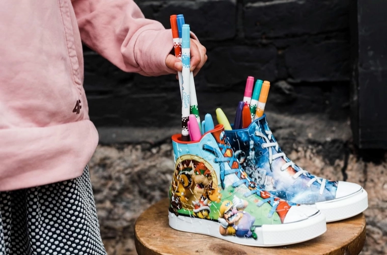 Maak van 108 kunststof puzzelstukjes deze klassieke sneaker met Super Mario-motief en creëer de perfecte kamerdecoratie! Na het in elkaar zetten wacht je nog een bonus: je kunt hem gebruiken voor kwasten, potloden, enz.