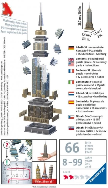 Ontdek de charme van het iconische New Yorkse landmark in een compact formaat. De mini 3D-puzzel Empire State Building vangt de architectonische details natuurgetrouw en dankzij de vormvaste kunststof stukjes blijft alles uitstekend zitten zónder lijm. Het in elkaar zetten is intuïtief – je kunt bouwen op basis van het motief of het praktische nummeringssysteem volgen.