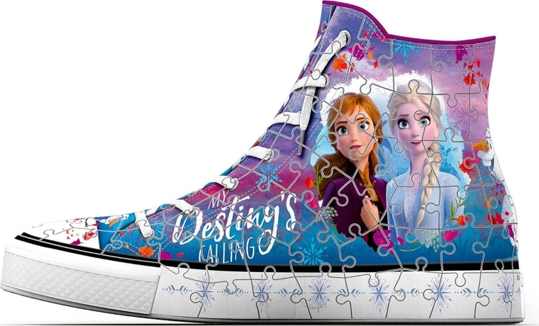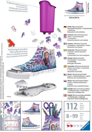 Geniale combinatie van plezier en functionaliteit: een 3D-puzzel in de vorm van een hoge sneaker met de geliefde heldinnen uit de film Frozen 2. Dankzij de stevige kunststof stukjes bouw je een duurzame decoratie die dient als pennenhouder voor pennen, potloden en scharen – zonder lijm, eenvoudig en met een perfect resultaat.
