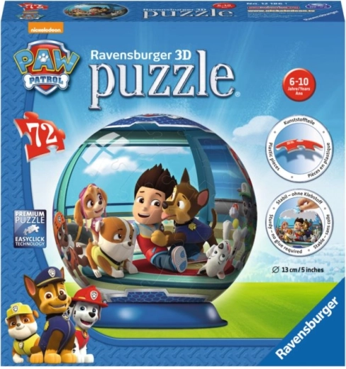 Ontdek het leuke puzzelen met de 3D puzzelbal van Ravensburger met Paw Patrol-motief voor kinderen vanaf 6 jaar. 72 stevige, gebogen stukjes passen precies in elkaar en vormen een kleurrijke sferische bal met favoriete helden zoals Chase, Marshall en Skye. Geweldig voor het ontwikkelen van logisch denken en concentratie, met een duurzame afwerking voor herhaald puzzelplezier.
