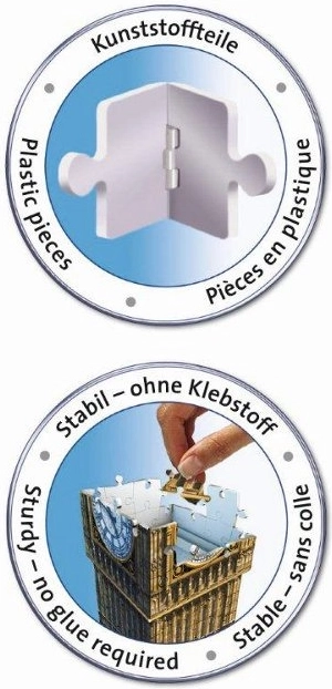 Maak een gedetailleerd model van de Londense Big Ben met deze fantastische 3D puzzel van Ravensburger. Met speciale gebogen of flexibele stukken, die precies op hun plaats passen, kun je eenvoudig een fascinerend model van beroemde gebouwen bouwen zonder lijm. Elk stuk is gemaakt van stevige kunststof, wat uitstekende stabiliteit van de hele constructie garandeert.
