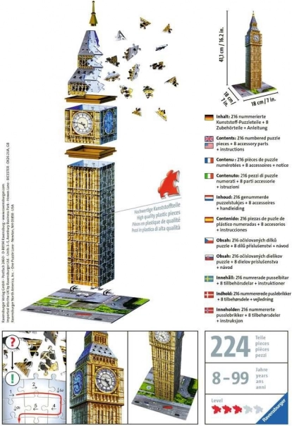 De set bevat in totaal 216 genummerde puzzelstukken, 8 stukken accessoires en een gedetailleerde handleiding. Na voltooiing is de puzzel ongeveer 18 x 18 x 41 cm groot. Dit model is ideaal voor zowel fans van het merk Ravensburger als voor degenen die van architectuur en Londen houden.