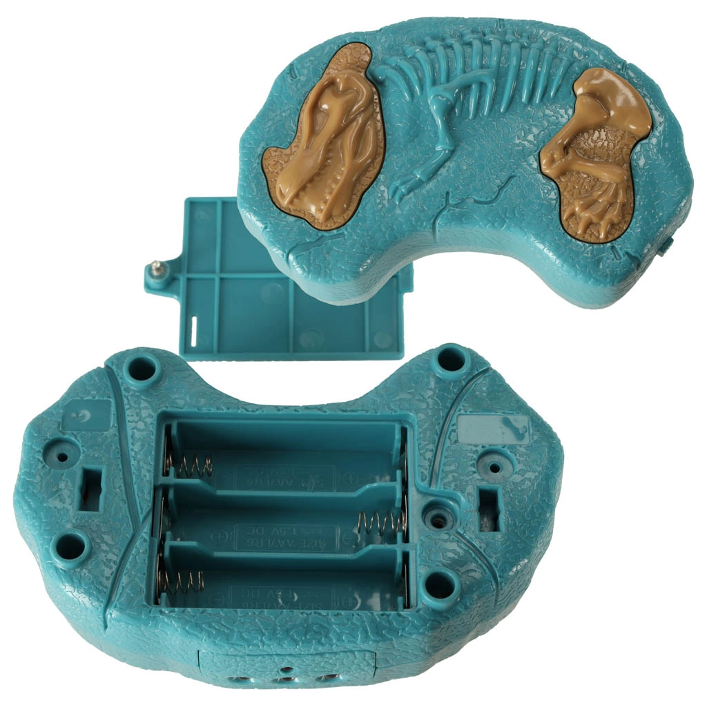 De afstandsbediening, die lijkt op een fossiel, met twee knoppen maakt het gemakkelijk om de bewegingen en geluiden van de dinosaurus te bedienen.