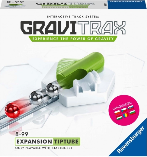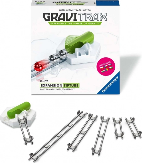 De uitbreiding GraviTrax TipTube is alleen compatibel met de startersset. De verpakking bevat: 1 actieve voorraadhouder, 1 lange rail, 2 middellange rails en 3 korte rails.