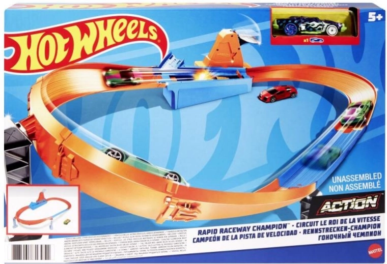 Met de set Rivaliteit van Kampioenen van HOT WHEELS genieten kinderen van races, drifts en stunts op oranje banen met launchers en bochten. Inclusief startpoort, krachtige lanceerder, omver te rijden vlaggetjes voor punten en 1 metalen autootje om meteen te starten.